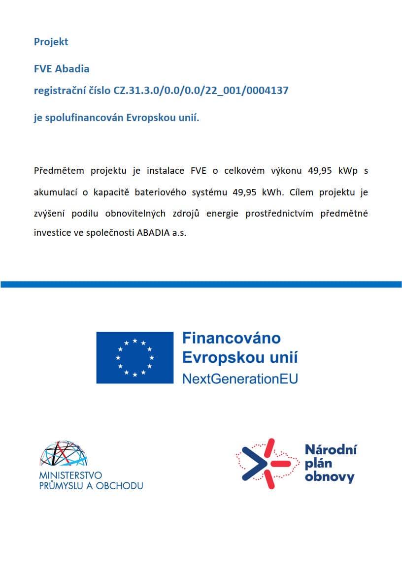 Společnost ABADIA a.s. realizuje druhou etapu instalace fotovoltaické elektrárny (FVE), která je spolufinancována Evropskou unií (registrační číslo CZ.31.3.0/0.0/0.0/22_001/0004137). K původní FVE s výkonem 30 kWp přidáváme nový systém s kapacitou 49,95 kWp a bateriovou akumulací o 49,95 kWh, čímž celkový výkon vzroste na 80 kWp.