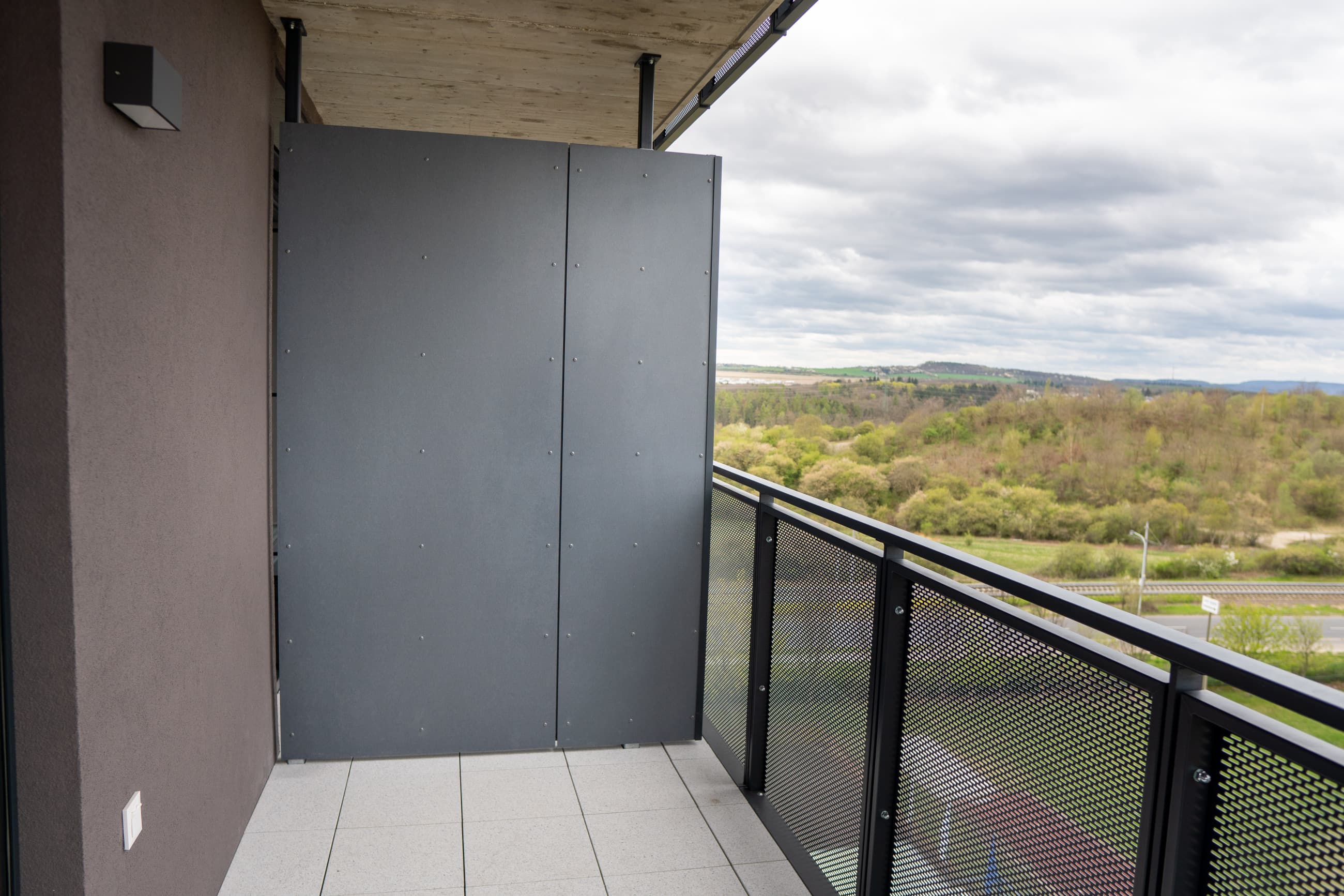 Poskytuje soukromí při zachování dostatečného průchodu světla.Kompaktní deska z vysokotlakého laminátu (Fundermax, Kronospan)