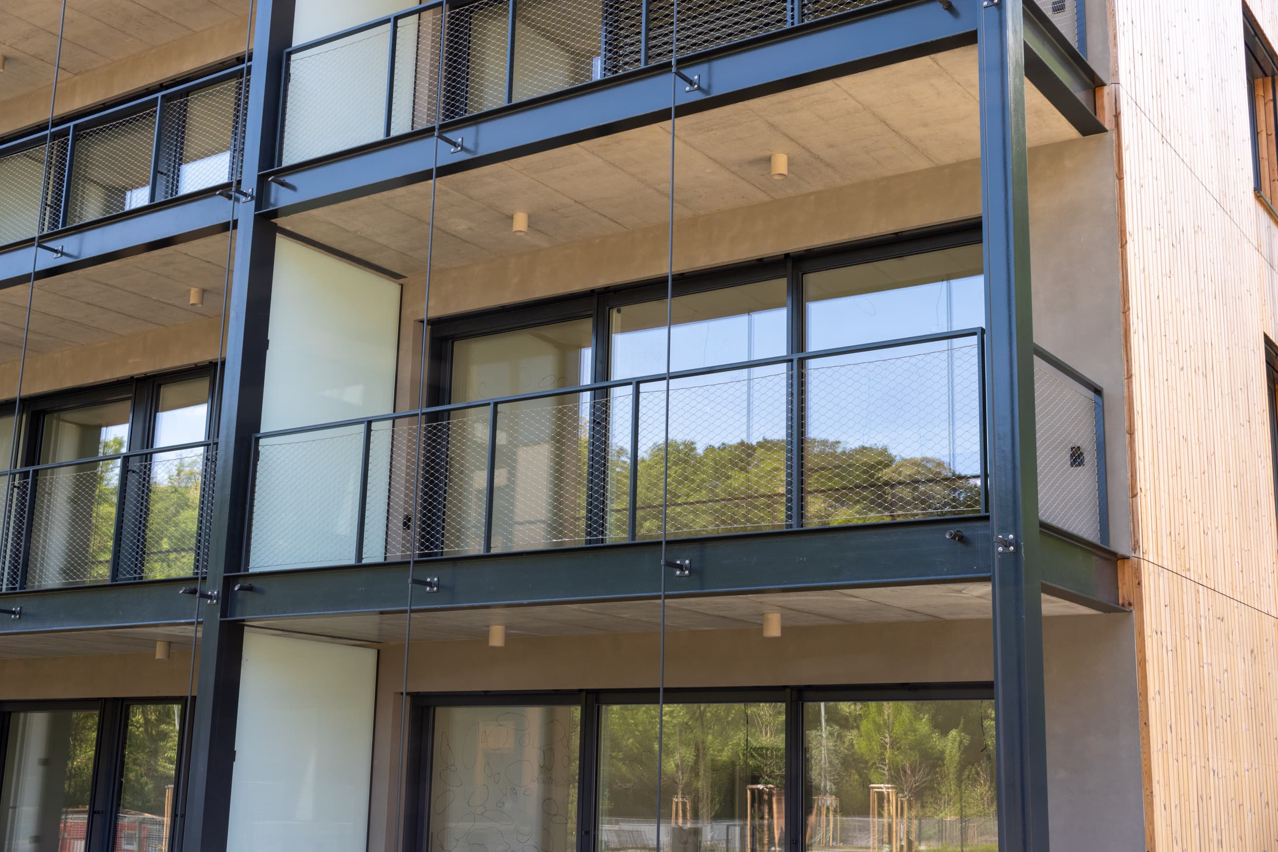 Skleněné panely upevněné bodovými úchyty nebo vetknuté do speciálního hliníkového profilu ve spodní části.Kompaktní deska (např. Fundermax)