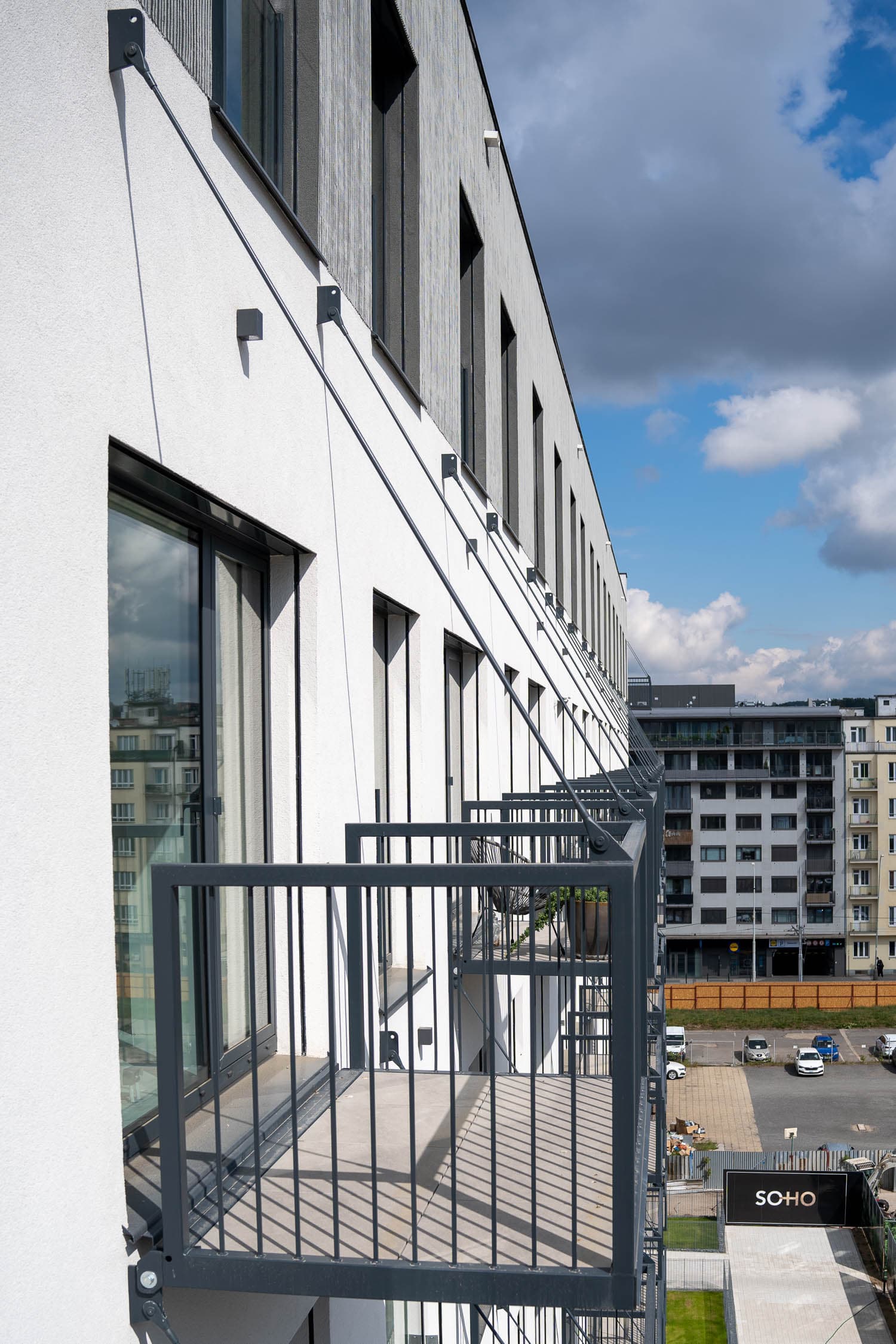 One of the projects where we have successfully installed balconies on beams is So-Ho Rezidence in Prague - a conversion of a former Tesla factory into a modern apartment building.