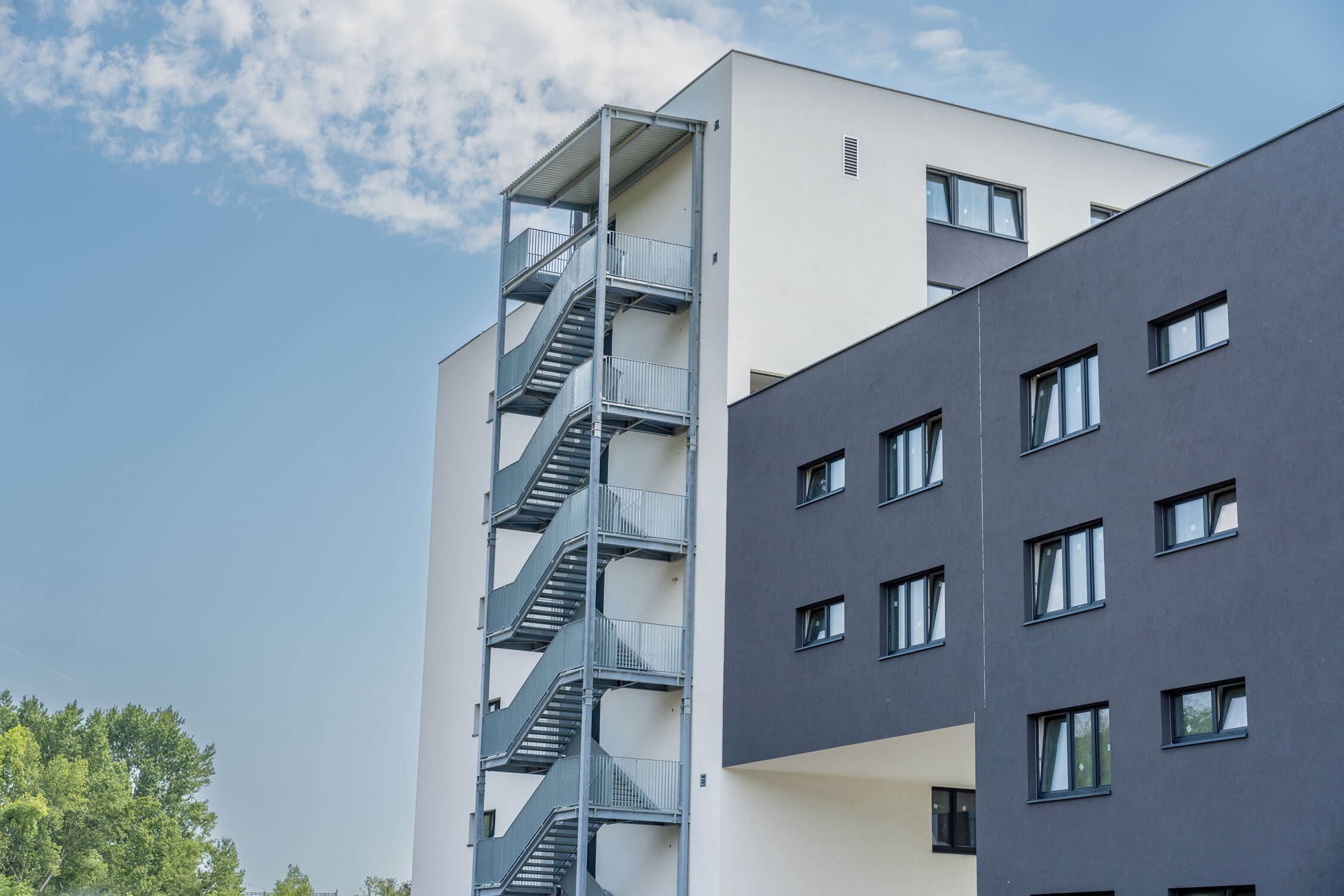Naše společnost měla za úkol dodat a namontovat čtyři požární úniková schodiště, každé s hmotností téměř 20 tun. Montáž těchto klíčových bezpečnostních prvků byla náročná, zejména kvůli svažitému terénu v blízkosti budov, ale s naším odborným týmem a zkušenostmi jsme se výzvě úspěšně postavili a projekt dokončili k plné spokojenosti klienta.