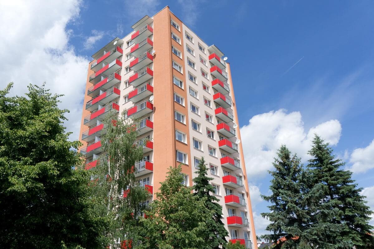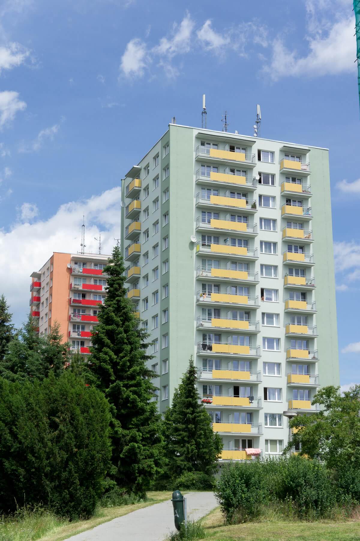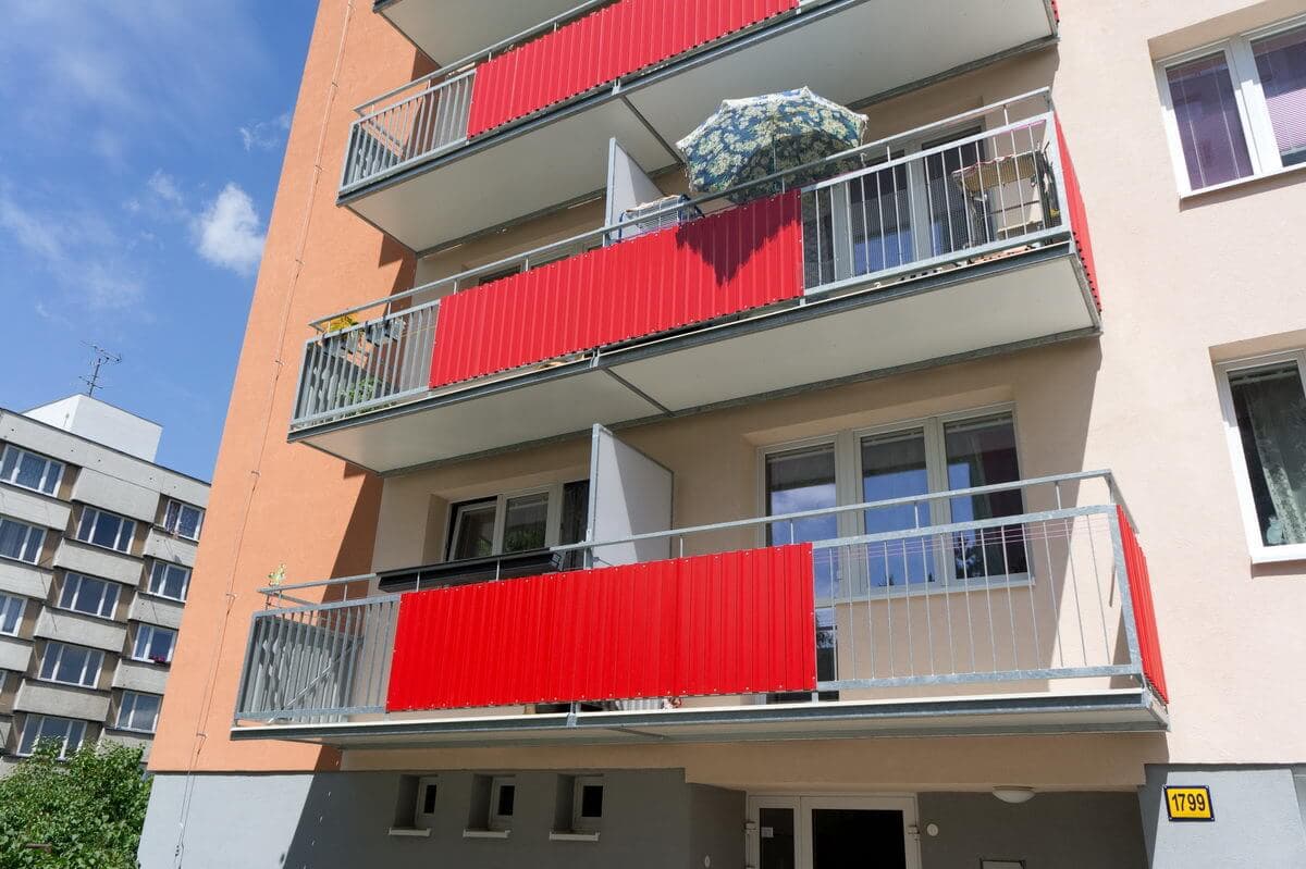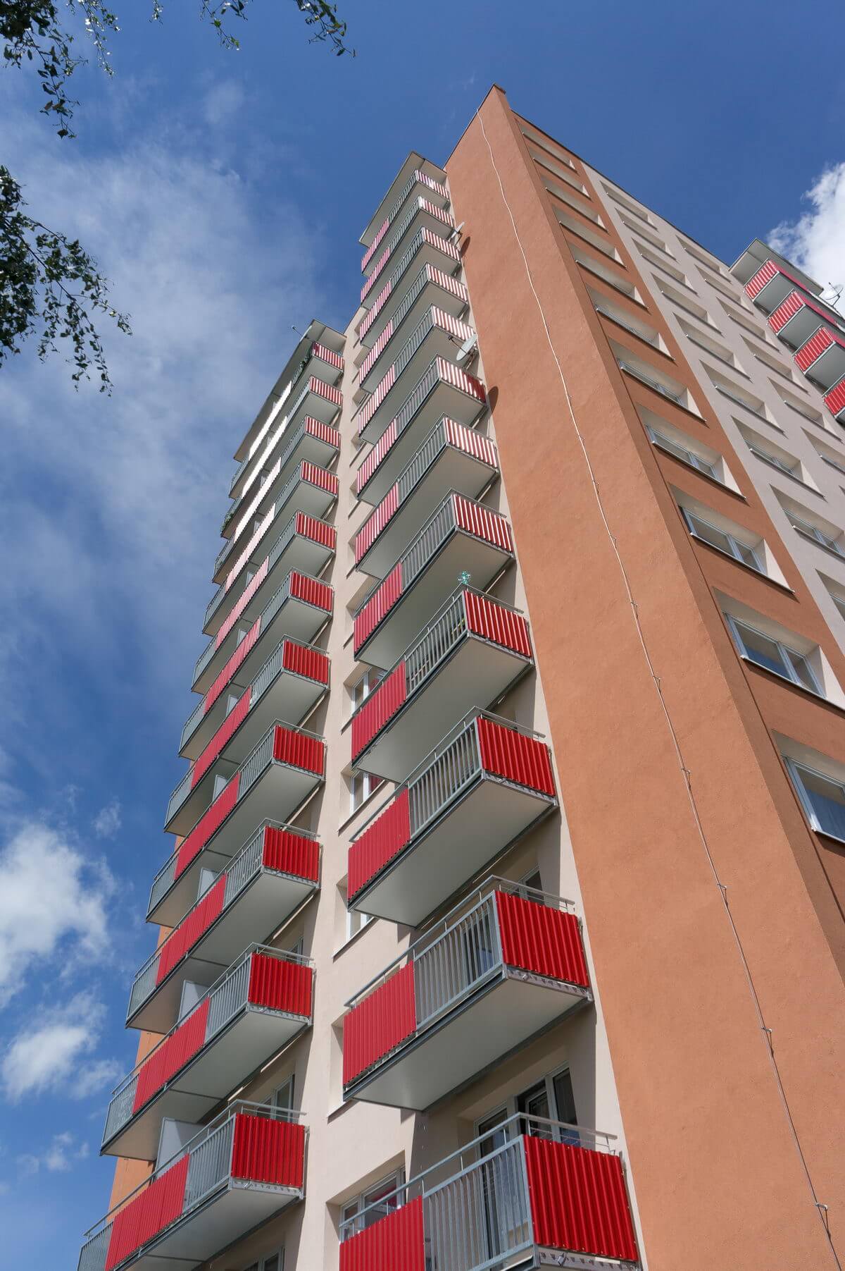 65 hranatých extraširokých balkonů o velikosti 7,2 x 1,3 m a 3,6 x 1,3 m, které nahradily původní staré balkony s betonovou podlahou. Výplň balkonů z trapézového lakovaného plechu.