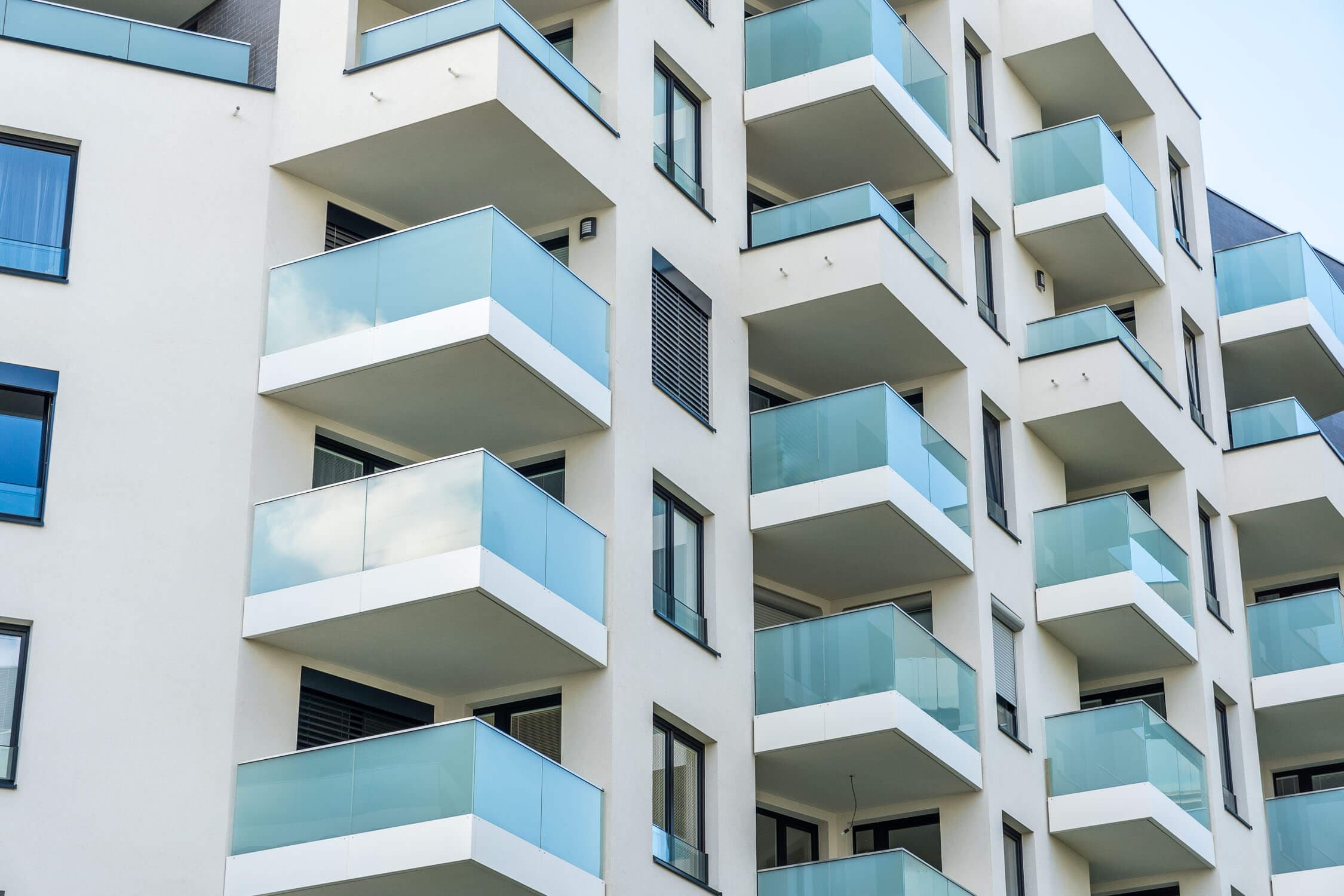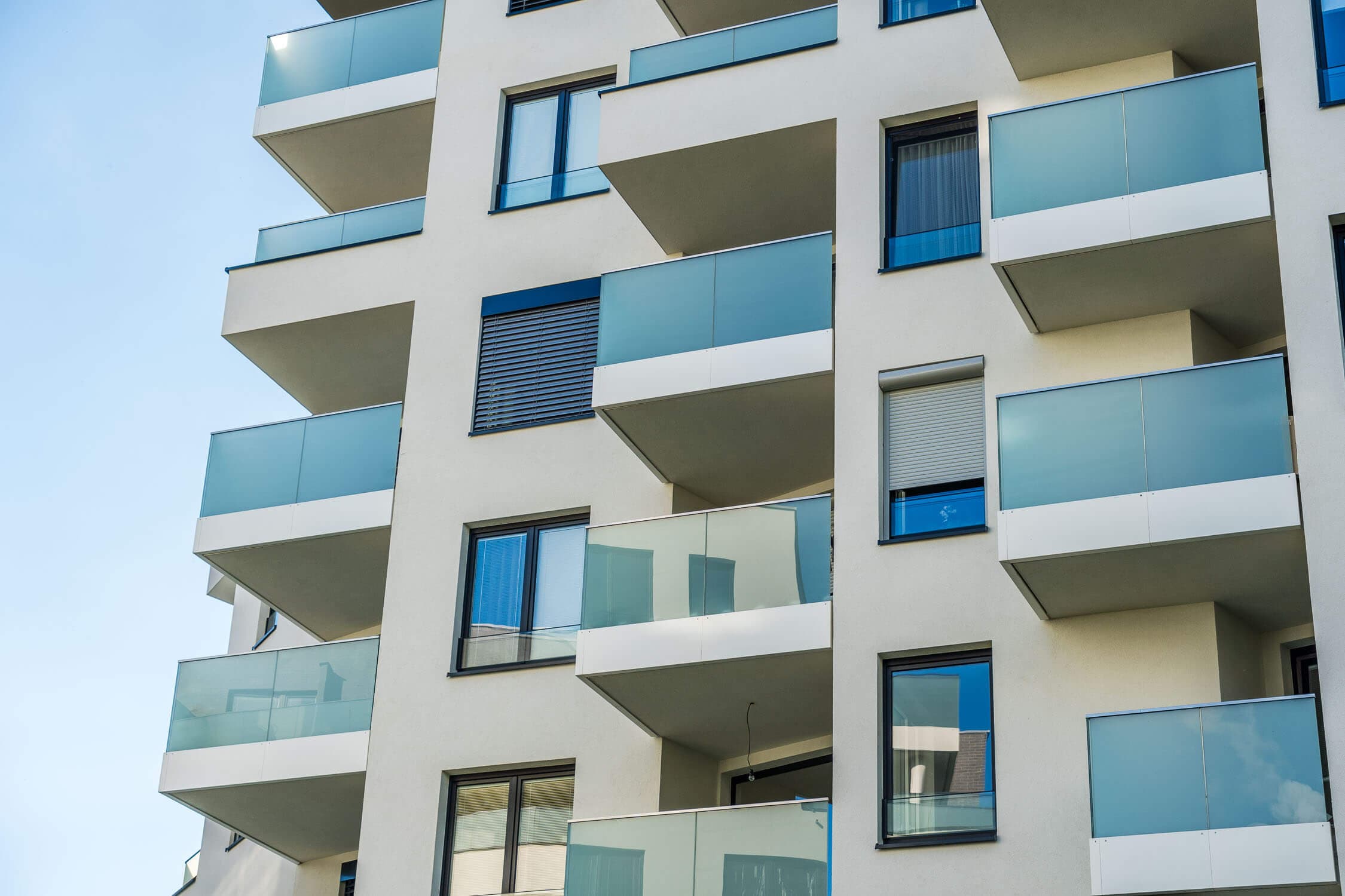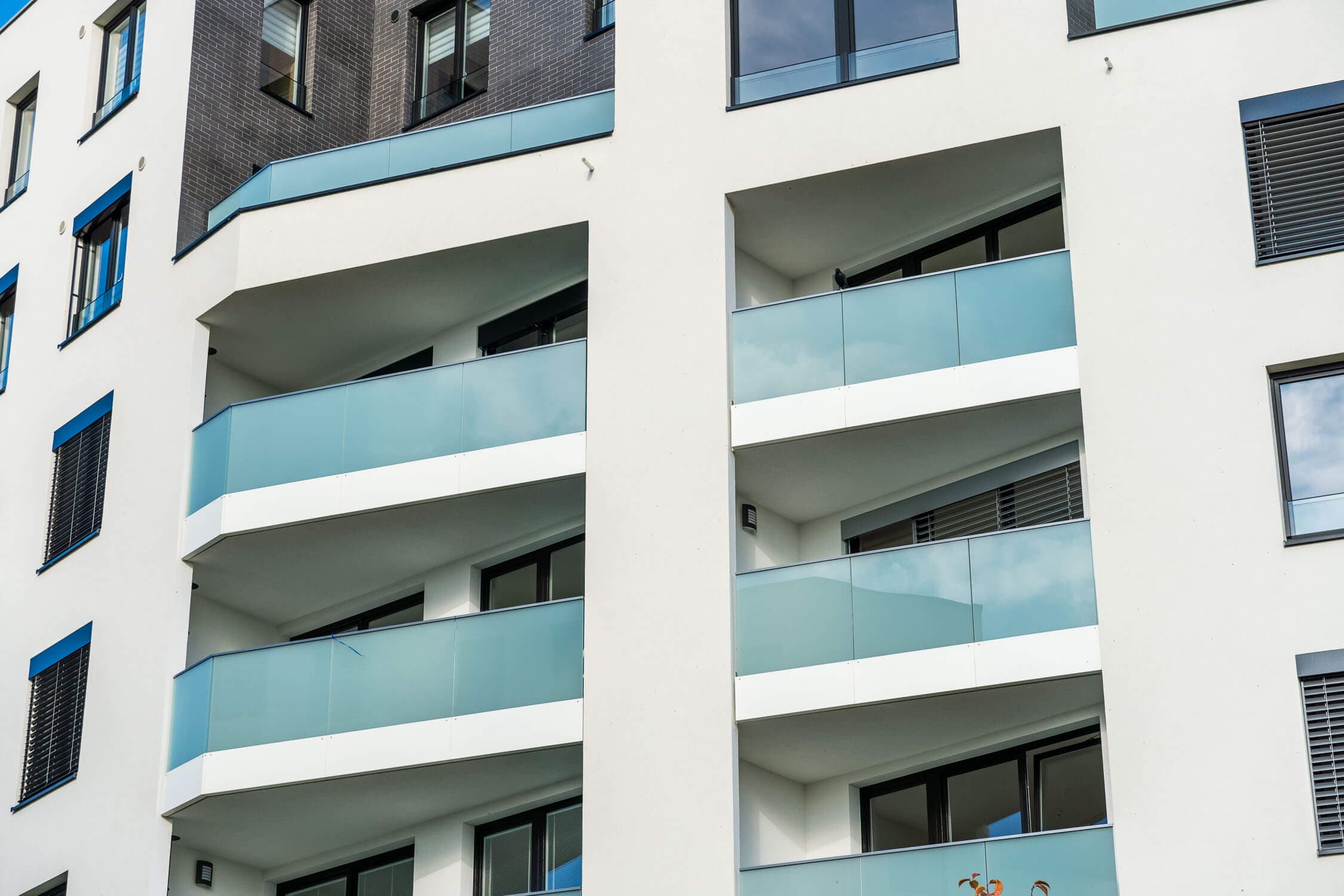 Součástí naší dodávky byla skleněná zábradlí pro terasy a balkony, u nichž bylo klíčové spojit bezpečnost, přesné provedení a čistý vzhled. Celkem jsme dodali více než 1200 metrů zábradlí s mléčným bezpečnostním sklem, které podporuje soukromí obyvatel a zároveň zachovává lehkost fasády.
