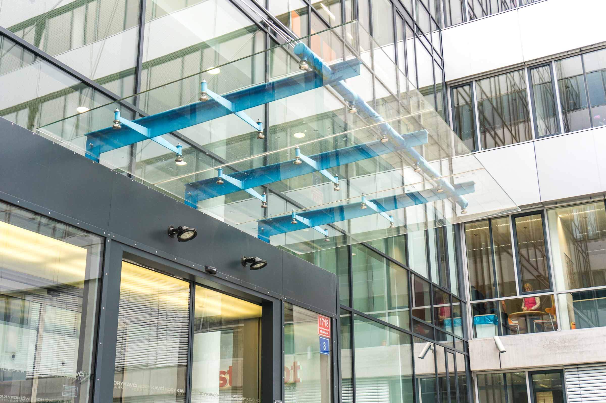 Pro Kavčí Hory Office Park jsme dodali dvě vstupní markýzy nad hlavními vchody do administrativních budov. Markýzy jsou tvořeny ocelovou konstrukcí, na které leží skleněné desky.