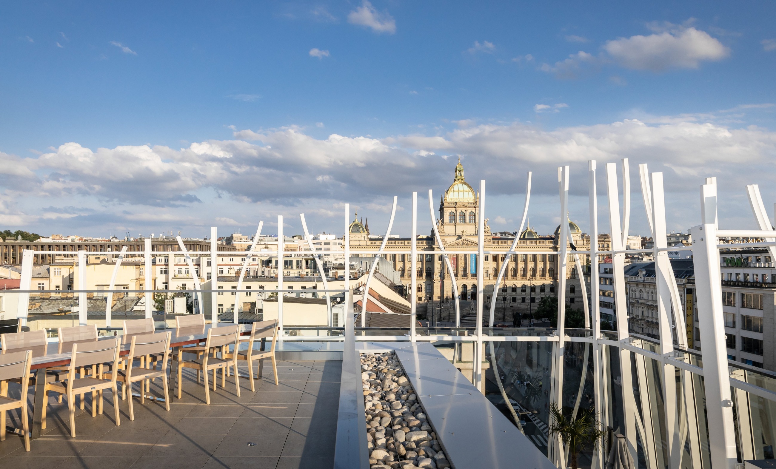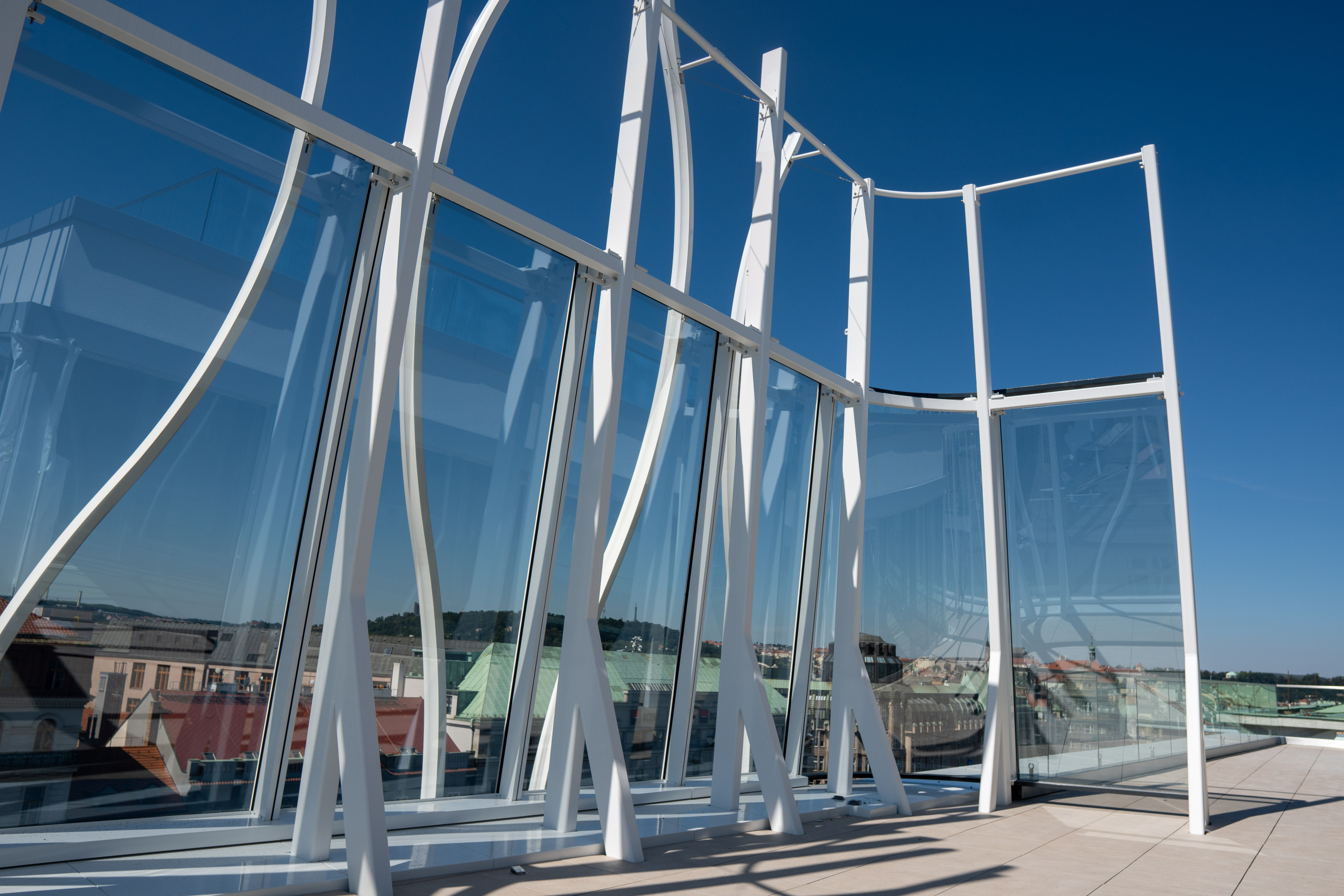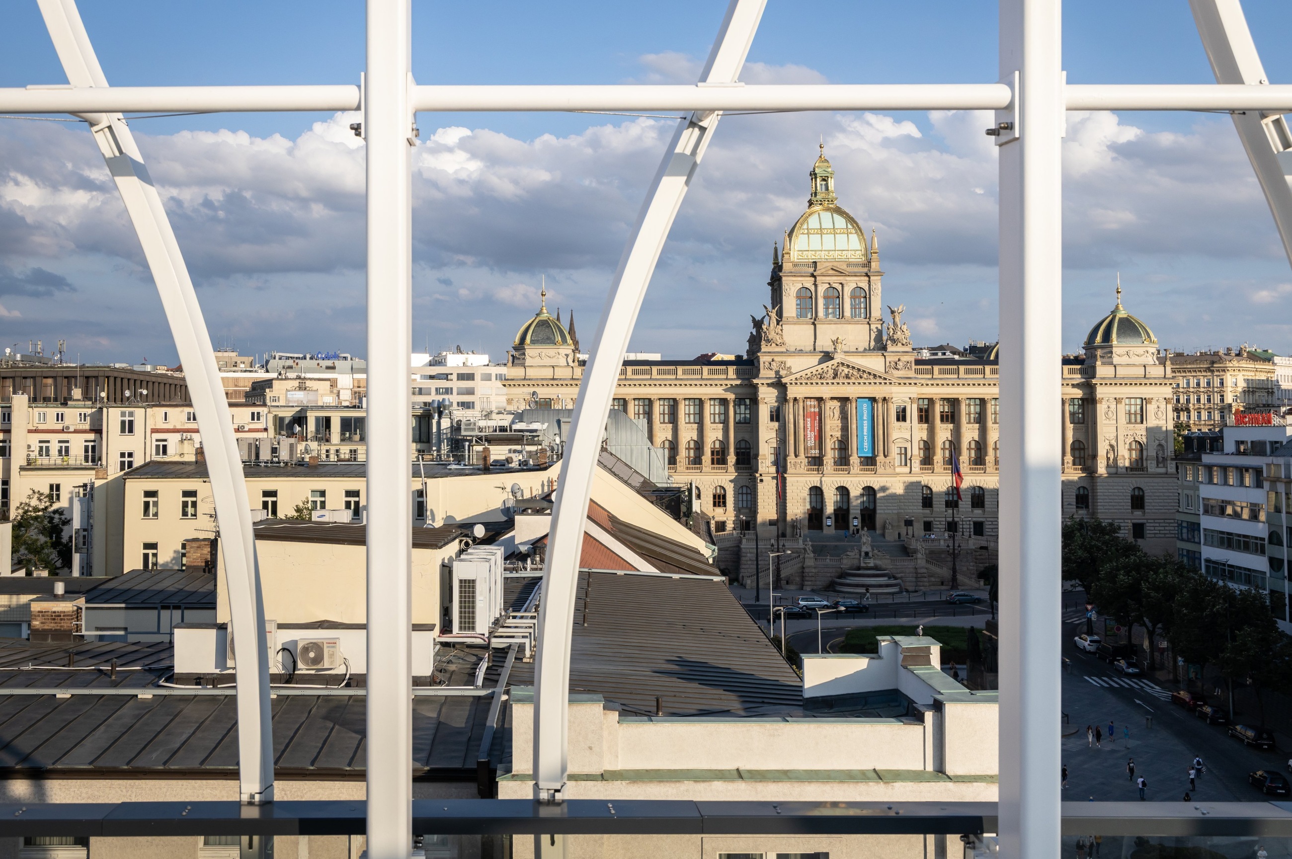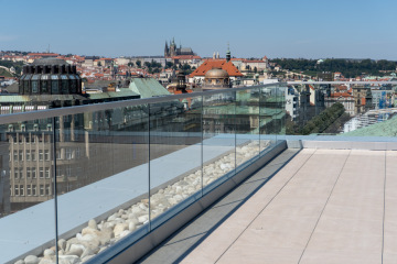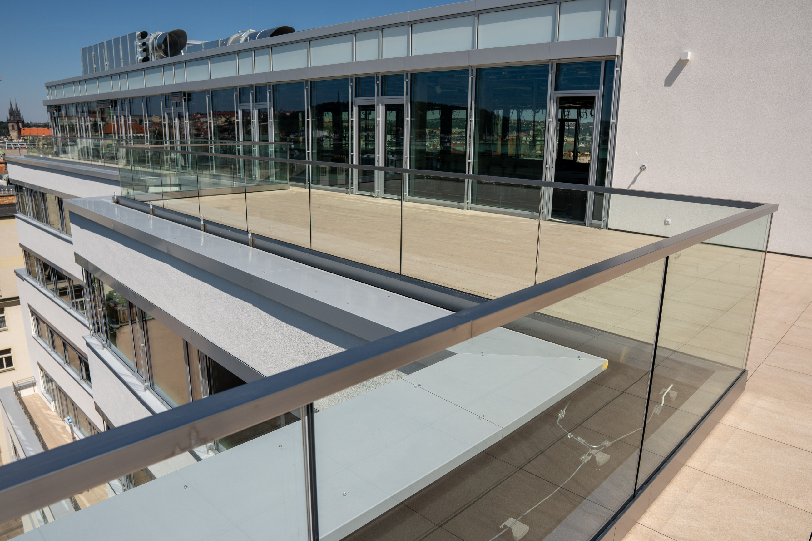 Na prostorných střešních terasách ve vyšších patrech budovy jsme realizovali více než 300 metrů celoskleněného zábradlí. Řešení bylo navrženo s důrazem na maximální transparentnost, bezpečnost a dlouhodobou provozní spolehlivost v exponovaném městském prostředí. Zábradlí umožňuje nerušené výhledy na Václavské náměstí, Hradčany i historické centrum Prahy a přirozeně navazuje na charakter fasády i celkový výraz stavby. Důležitou roli zde sehrál detail kotvení, návaznost na hydroizolace a přesné provedení všech styčných míst.