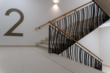 Součástí naší dodávky byla také realizace vnitřních zábradlí na schodištích, jejichž výplň tvoří dynamicky tvarované pruty ohnuté do jemného tvaru písmene S. Tento prvek dodává komunikačním prostorům pohyb a eleganci, aniž by narušoval jejich funkčnost nebo přehlednost. Zároveň jsme na objektu dodali kompletní spektrum navazujících zámečnických prvků, které bylo nutné sjednotit materiálově, technicky i vizuálně napříč celou budovou. The Flow Building je příkladem projektu, kde zámečnické konstrukce nejsou pouze technickým detailem, ale plnohodnotnou součástí architektury.