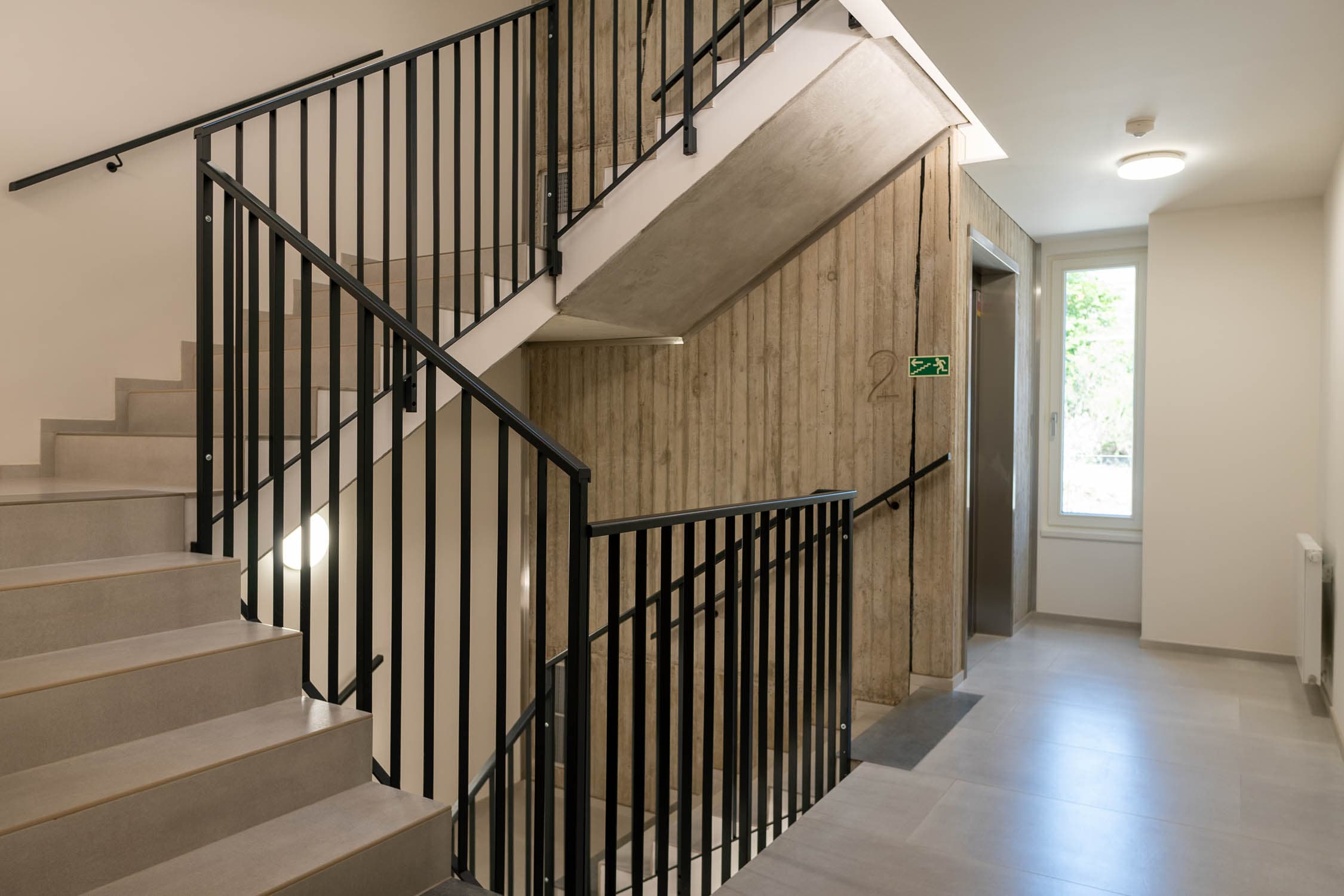 Dále jsme dodali zábradlí pro prostorná vnitřní schodiště, která přispívají k otevřenému a vzdušnému vzhledu interiéru. Kromě toho jsme se podíleli na výrobě zábradlí lávek u vstupů, krytí stání pro kontejnery a dalších zámečnických prvků a konstrukcí.