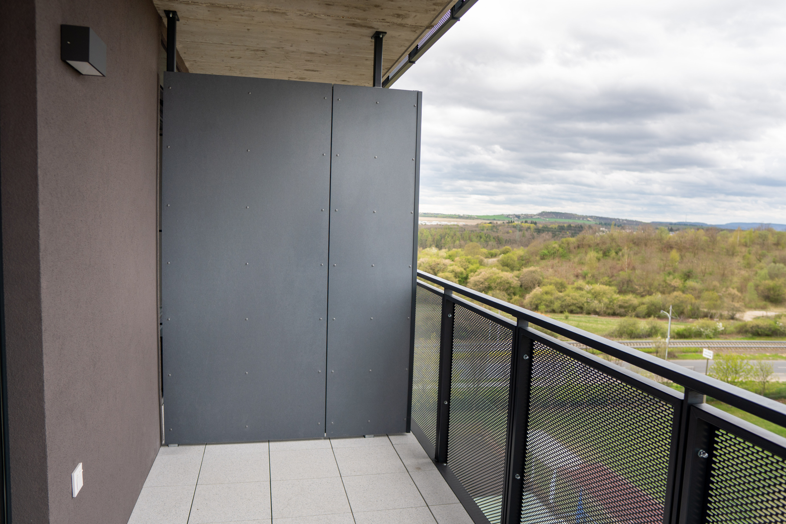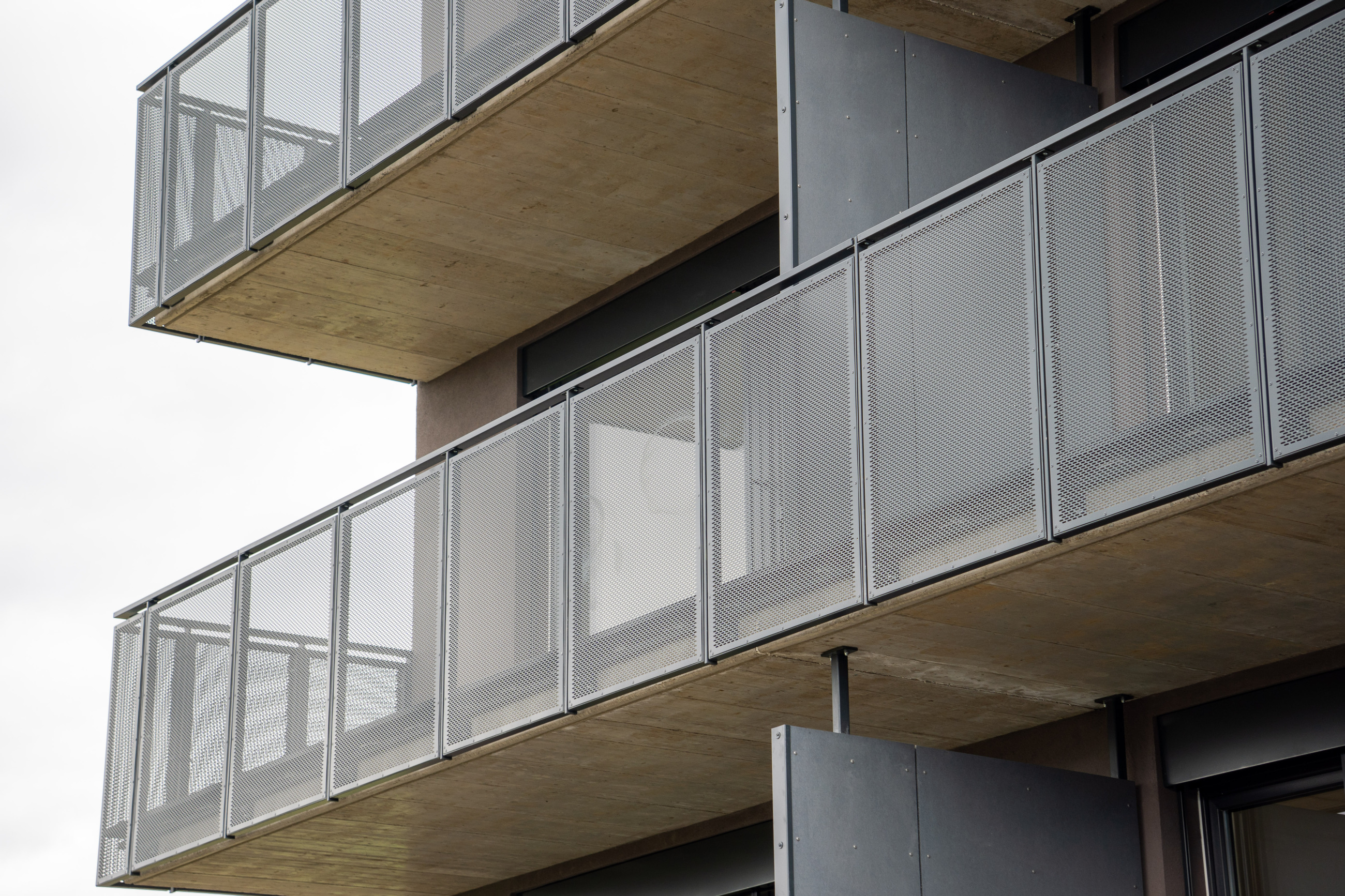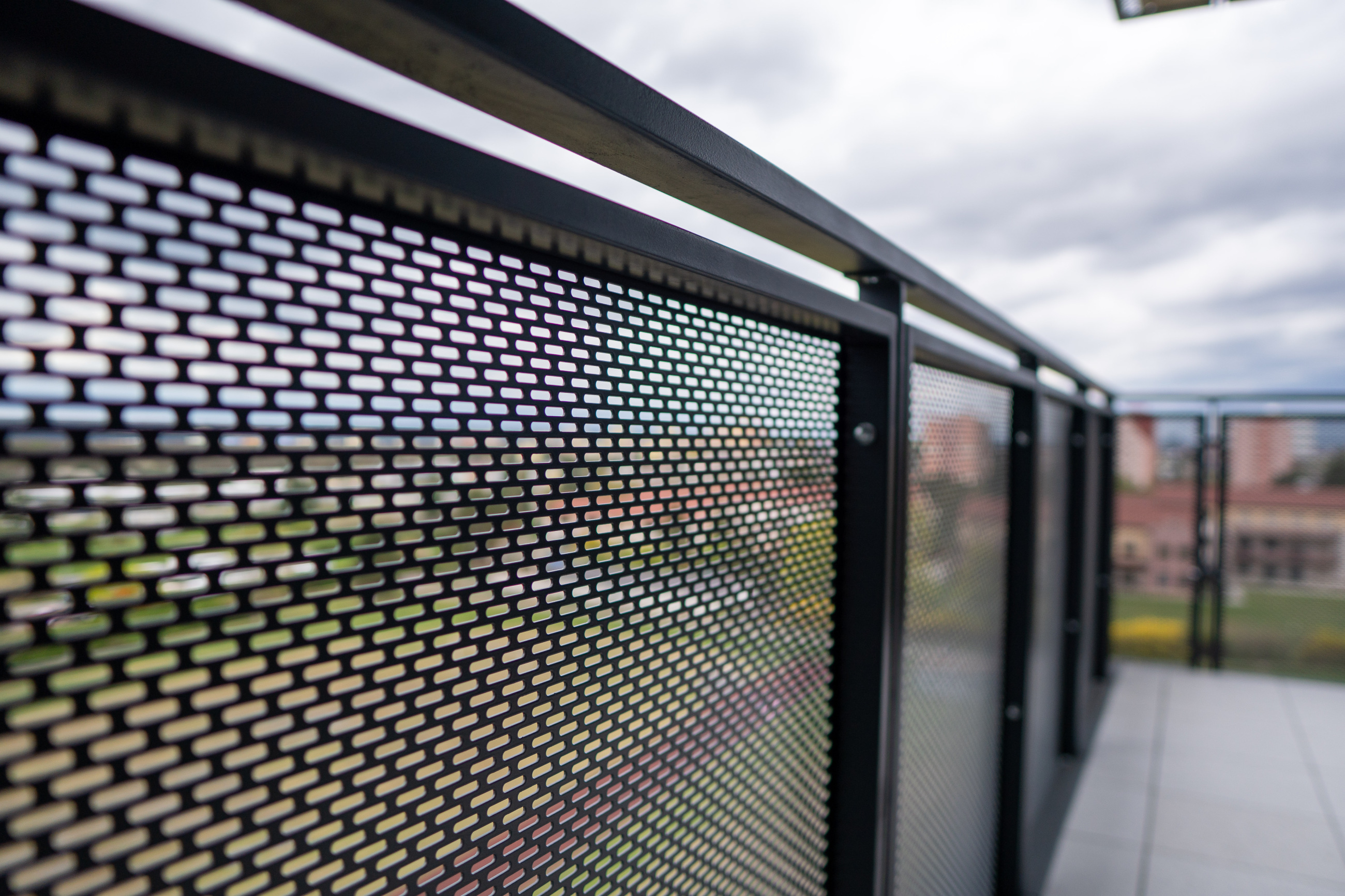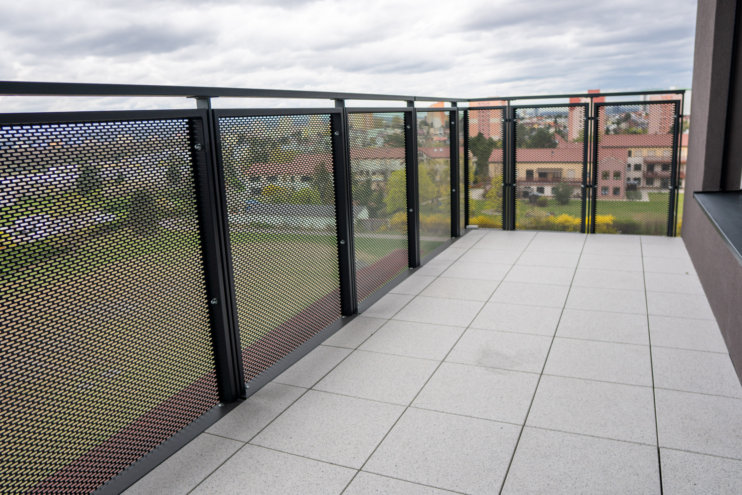 Venkovní zábradlí a balkonové výplně využívají děrovaný plech, který zajišťuje bezpečnost, částečné odstínění soukromí a zároveň zachovává vizuální kontakt s okolím. Řešení respektuje střídmý výraz fasády a navazuje na rastrové členění objektu.