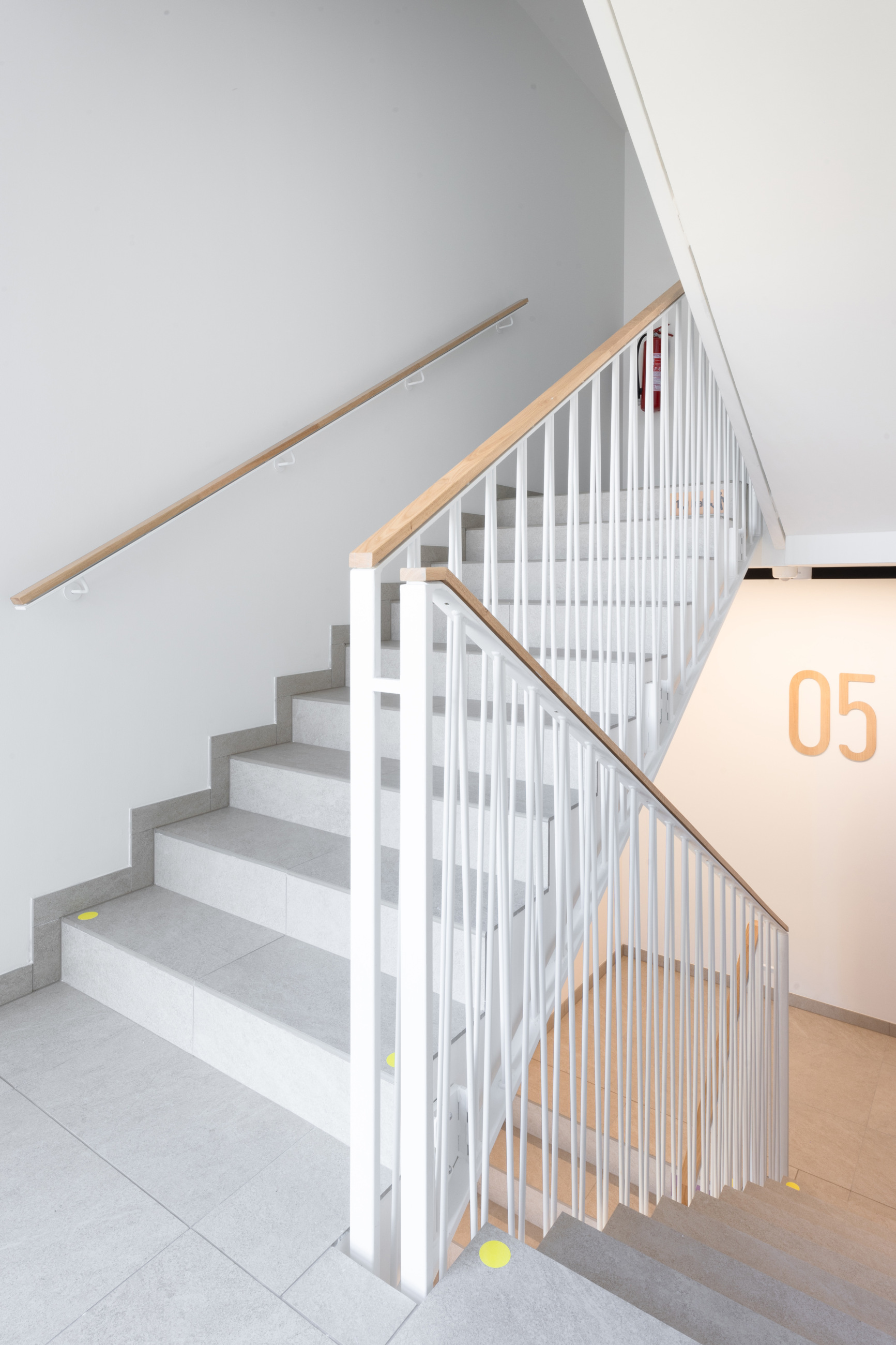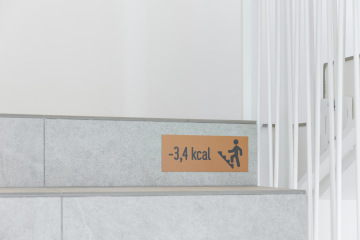 Na schodištích jsme řešili také orientační a motivační značení, které doplňuje funkčnost společných prostor. I drobné prvky jsme navrhovali tak, aby byly přirozenou součástí celkového řešení domu.