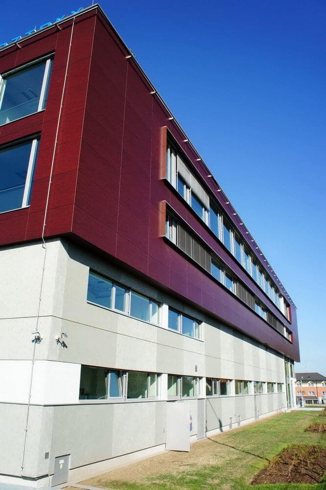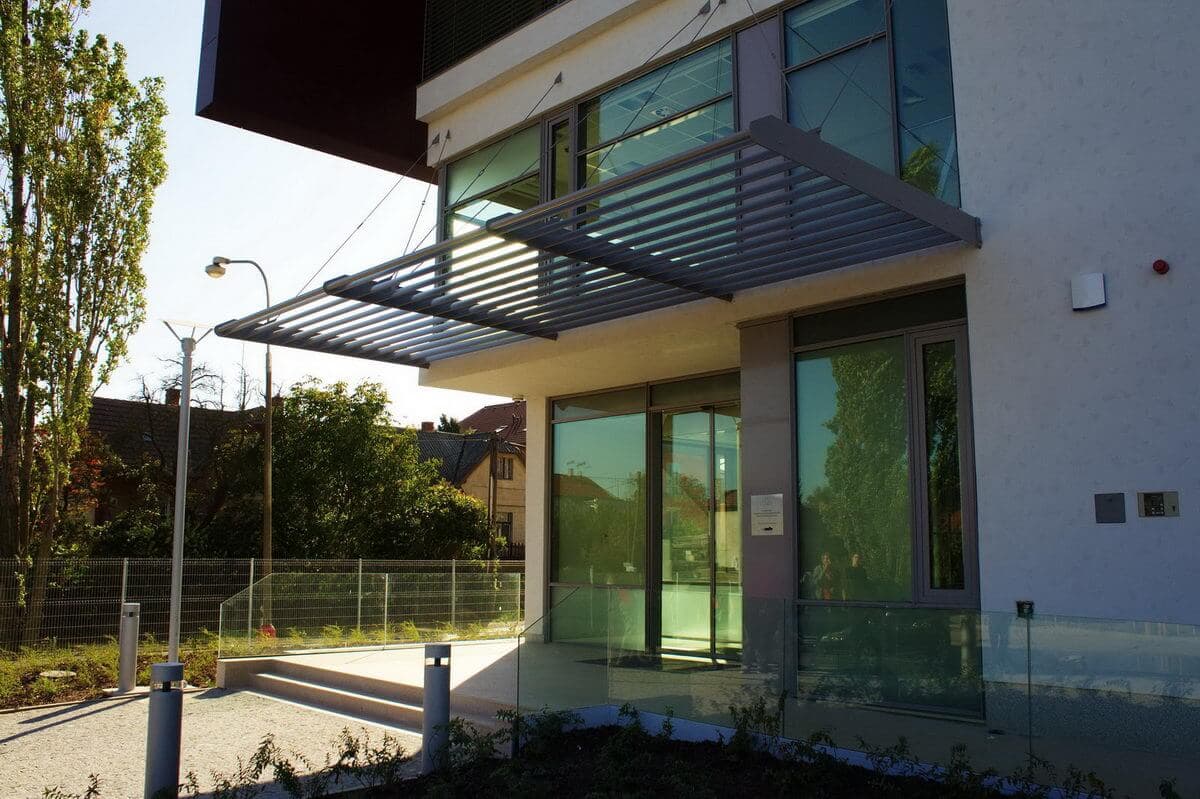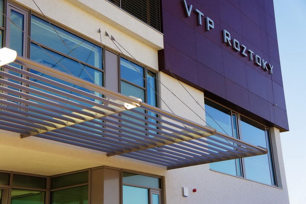 Při výstavbě Vědeckotechnického parku v Roztokách u Prahy jsme byli dodavatelem schodišťových zábradlí, které jsou vyvedené v efektní nerezi, jež se doplňuje se skleněnými výplněmi, a baluster v exteriéru i interiéru. Dále jsme dodávali vstupní lamelovou markýzu, únikové venkovní ocelové schodiště, mycí systém fasády a další zámečnické prvky.